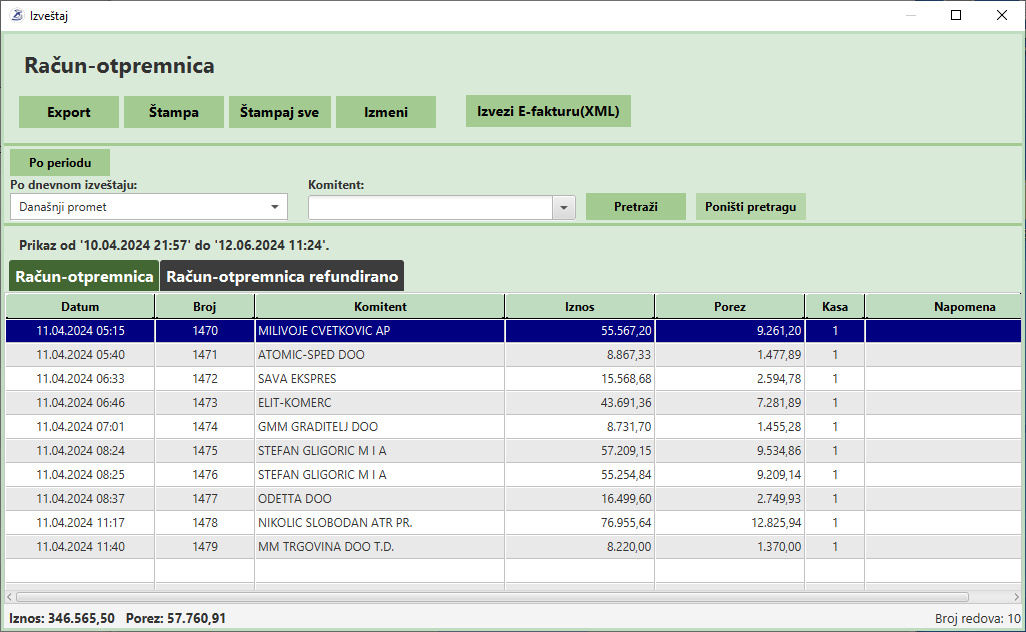 Prozor račun-otpremnica prikazuje sve kreirane otpremnice-račune. U samom prozoru mogu se kreirati nove, izmeniti postojeće, brisanje, štampa na fiskalnom štampaču, izvoz podataka.