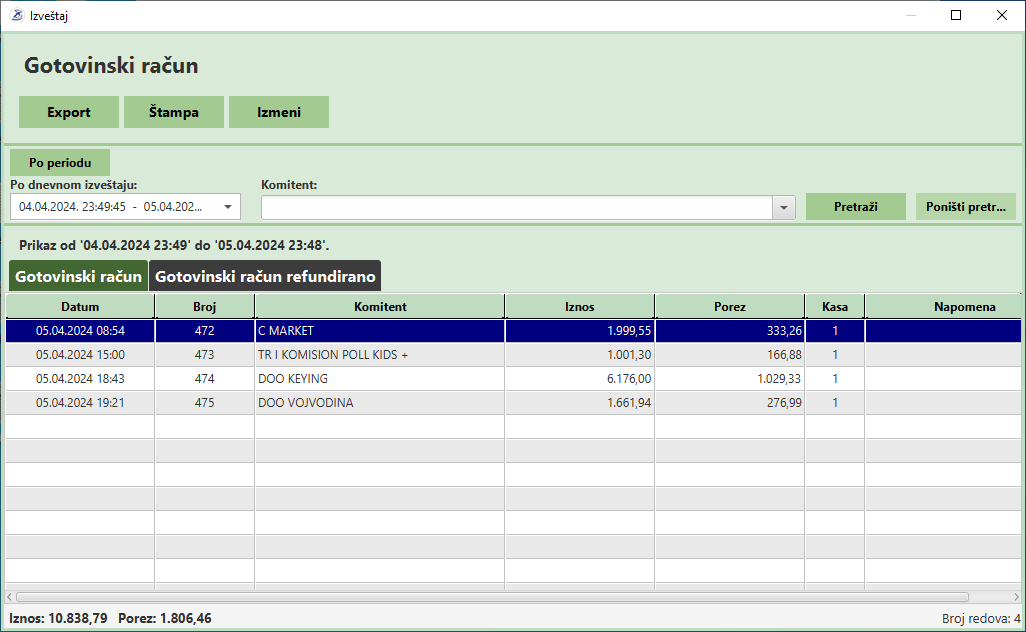 Prozor gotovinski račun omogućava pregled, unos, izmenu, brisanje i izvoz gotovinskih računa