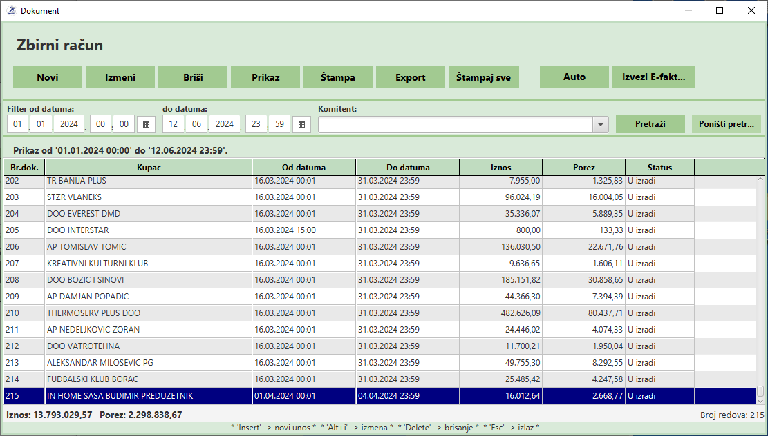 Prozor zbirni račun omogućava pregled, unos, izmenu, brisanje, automatsko kreiranje za određeni period, izvoz podataka točenja.