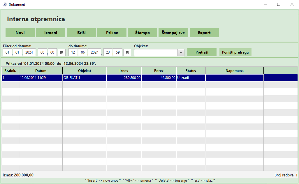 Prozor interna otpremnica je za firme koje imaju više benzinskih stanica i vrše prenos robe sa jedne stanice na drugu. Omogućen je unos, prikaz, izmena, brisanje, izvoz podataka.