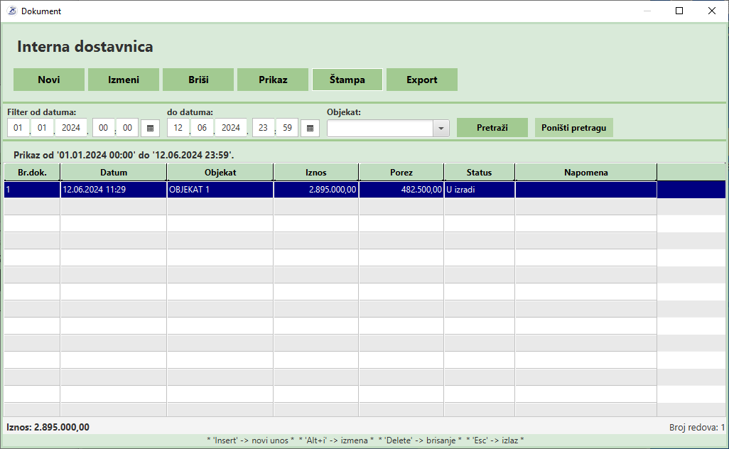 Prozor interna dostavnica je za firme koje imaju više benzinskih stanica i vrše prenos robe sa jedne stanice na drugu. Omogućen je unos, prikaz, izmena, brisanje, izvoz podataka.