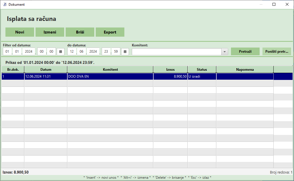 Prozor isplata sa računa je prikaz svih iznosa koji su uplaćeni dobavljačima.