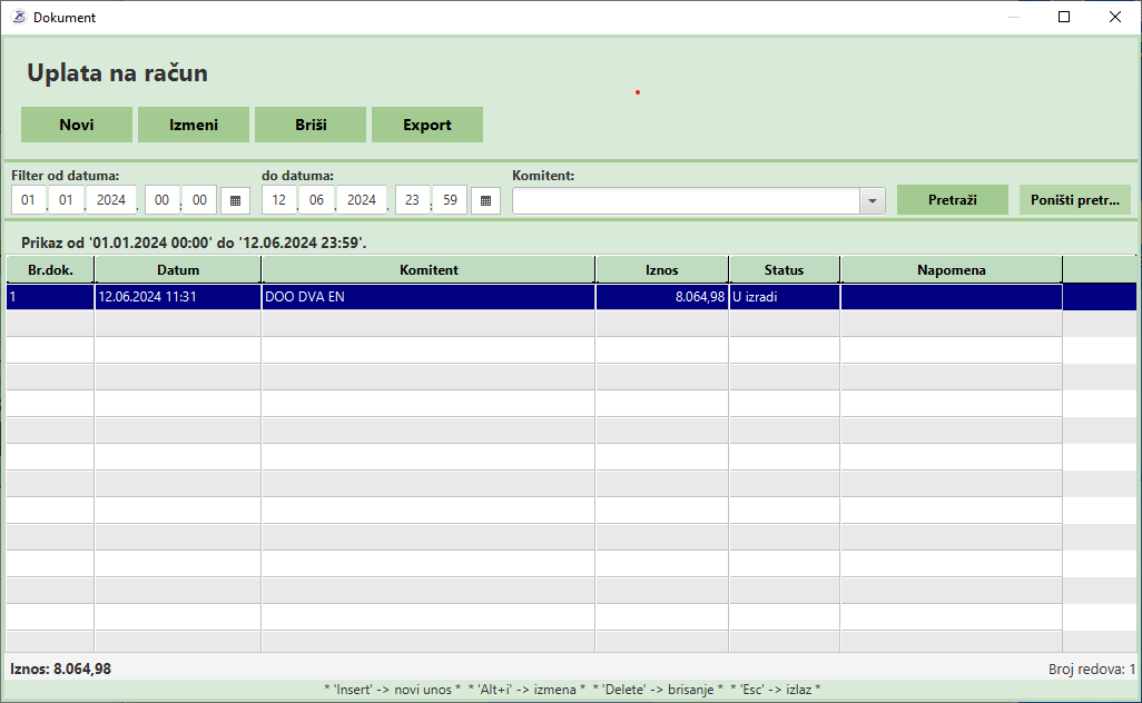 Prozor uplate na račun je prikaz svih iznosa koji su uplaćeni od strane Vaših kupaca.