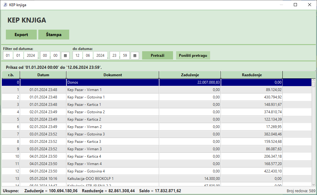 Prozor KEP knjiga je knjigovodstveni prikaz trenutnih zaliha na materijalnom nivou.