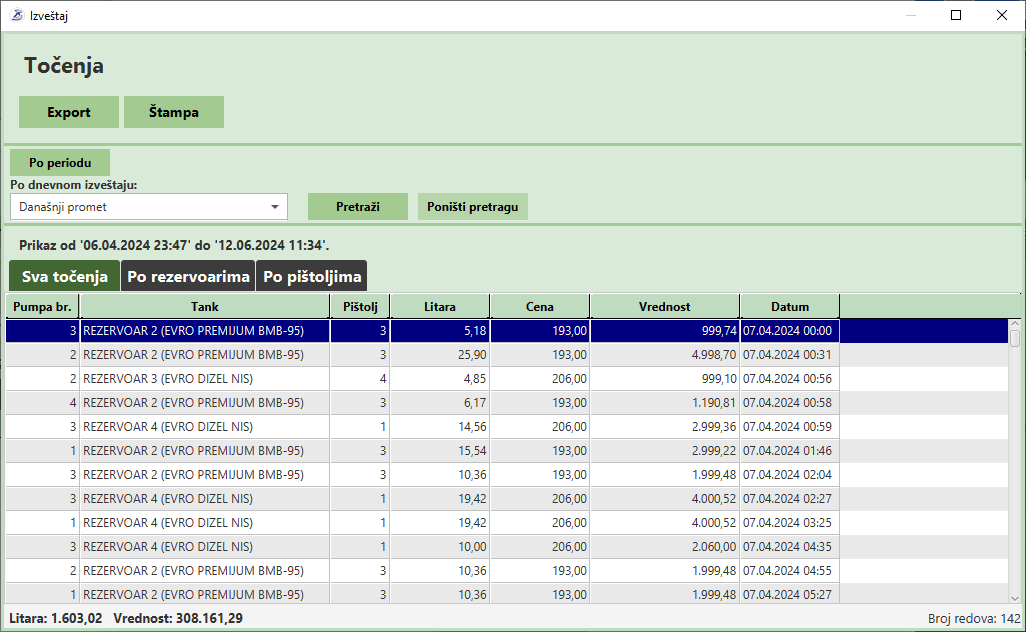 Prozor dnevni pumpni izveštaj omogućava pregled, toka istakanja goriva po pumpama i pištoljima.