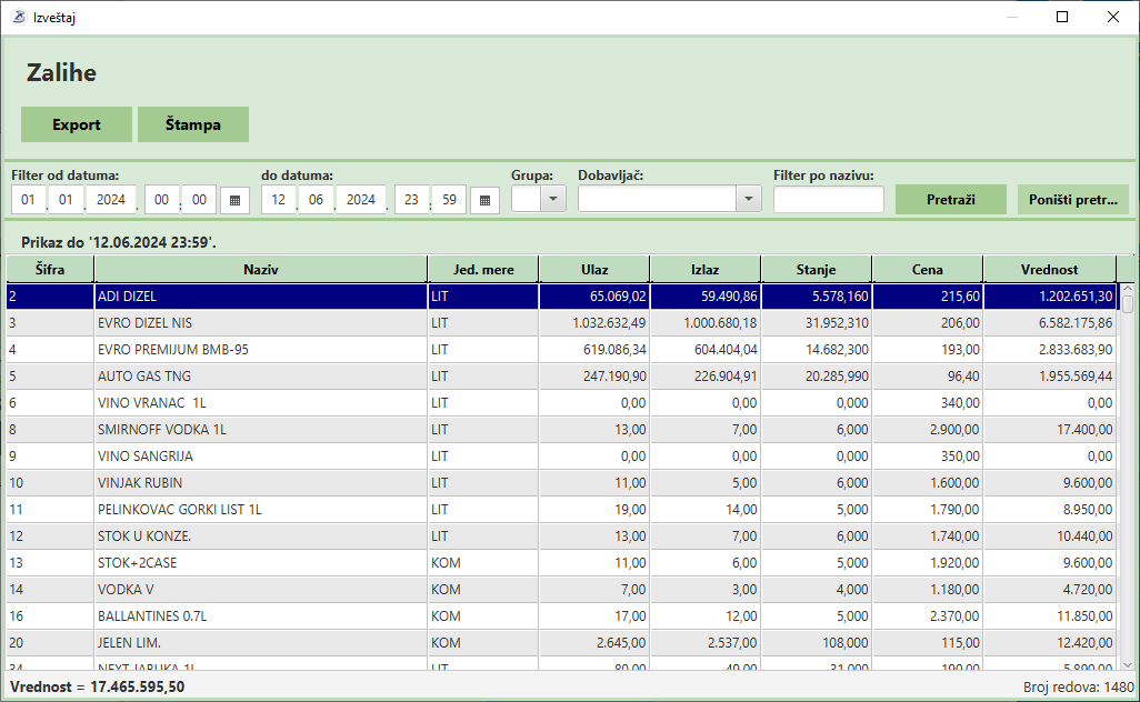 Prozor zalihe je kompletna evidencija zaliha robe trenutno, do određenog perioda, po artiklima, dobavljačima.