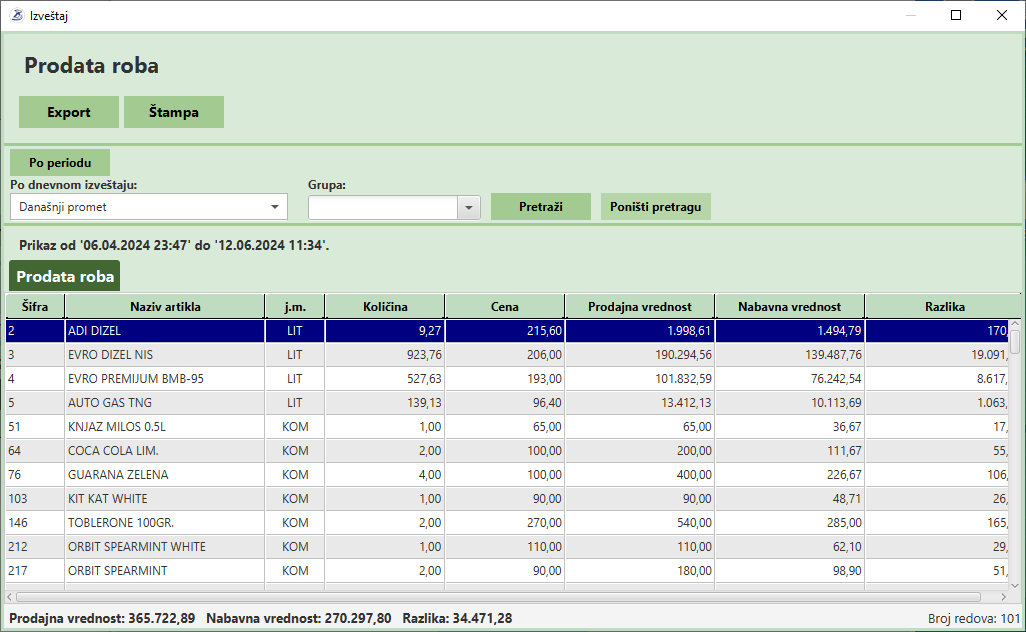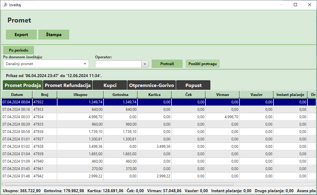 Prozor promet prikazuje prodaju napravljenu u današnjem danu, ali takođe i za zadati određeni period. Mođe se pregledati ukupan, po otpremnici, po kupcu, sa popustima, po internim otpremnicama.