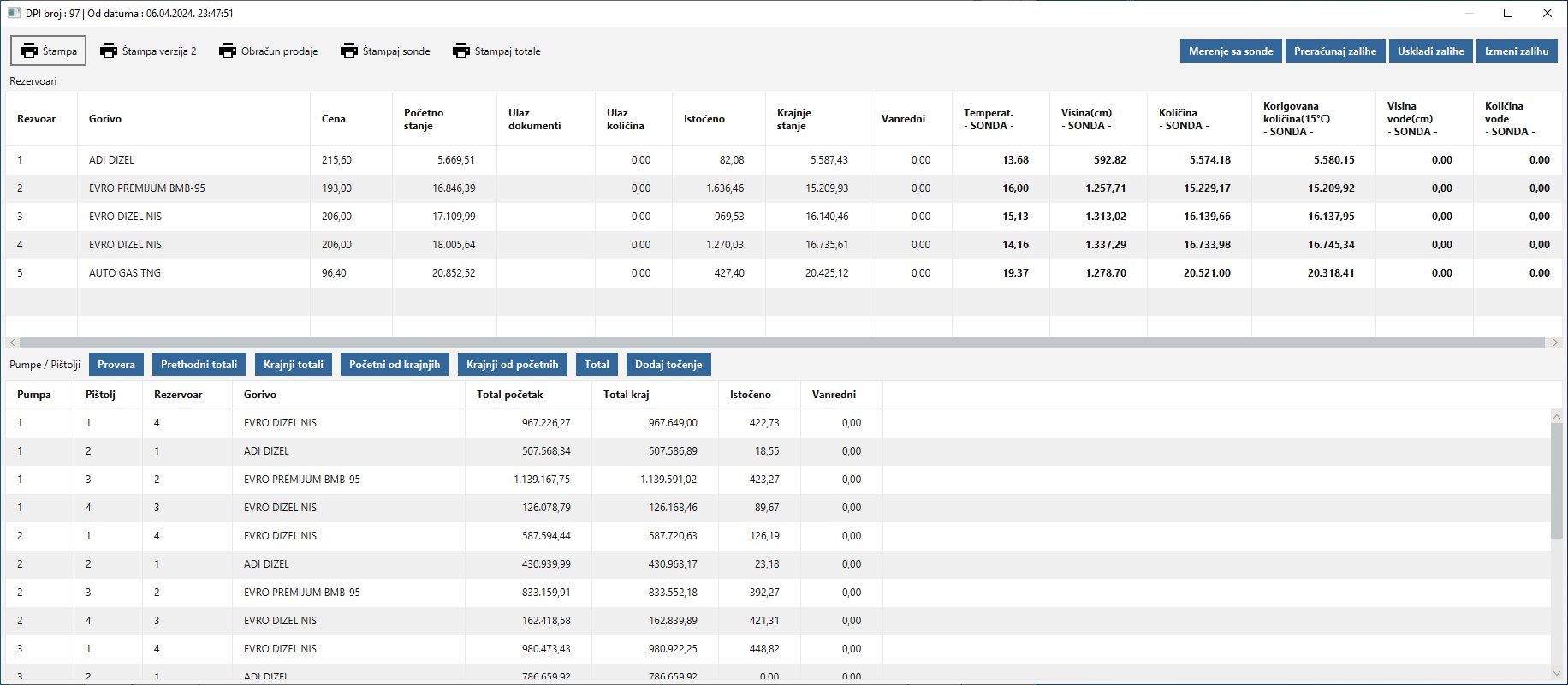 Totali je glavni prozor preko koga se prate količine istočenog goriva i prilikom završetka dana kreira DPI.