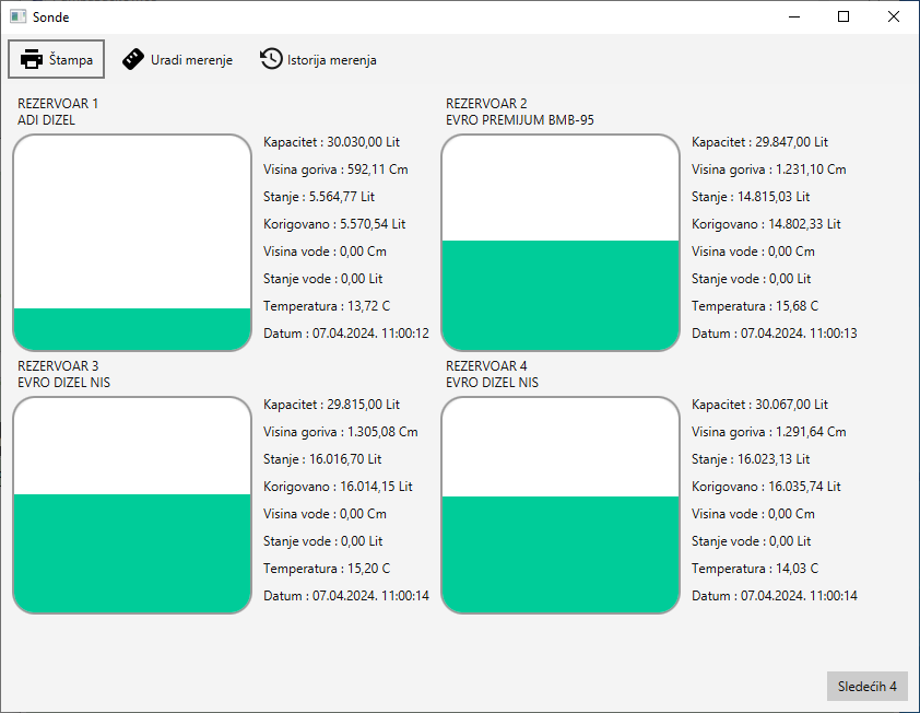 Sonde mere nivo goriva u rezervoarima i ima se uvid u stanje goriva, vode, temperature. Sistem vrši temperaturnu korekciju na 15°C.