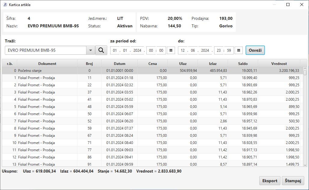 Kartica artikala prikazuje kompletan tok određenog artikla za određeni period. Kada su bili ulazi, izlazi tog artikla, otpisi, trenutni saldo...