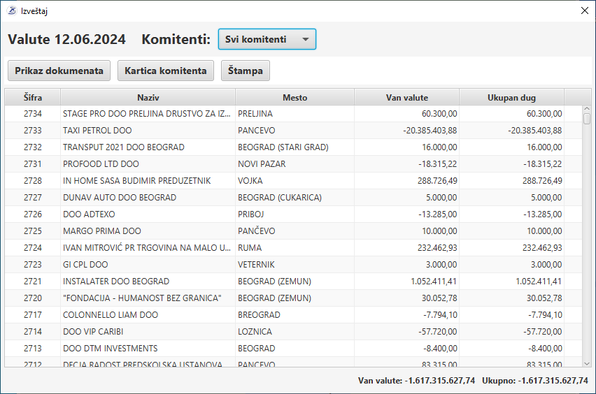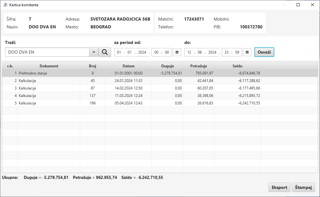 Prozor kartica komitenata prikazuje sve podatke, dokumenta i transakcije za određenog klijenta.