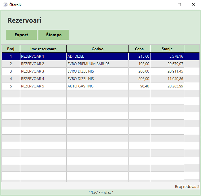 Prozor rezervoari pokazuje vrstu goriva u određenom rezervoaru, cenu, trenutno stanje goriva.