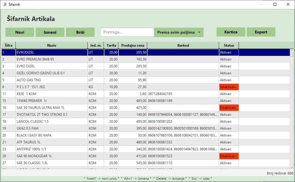 Artikli je meni preko koga se vrši administracija unosa, izmene i brisanja novih artikala. Meni kartica prikazuje kompletan izveštaj za određeni artikal (ulaz, izlaz, nivelacija ... ). Takodje može lista artikala da se izveze u .xls format.