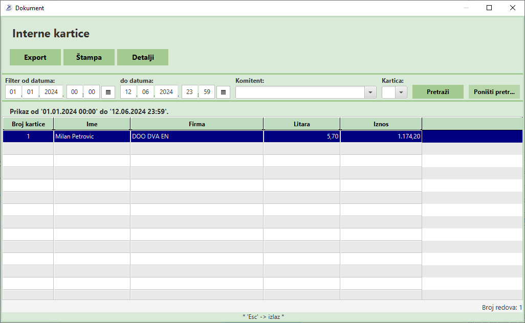 Interne kartice - kartice prikazuje transakcije obavljene putem platnih i internih kartica.