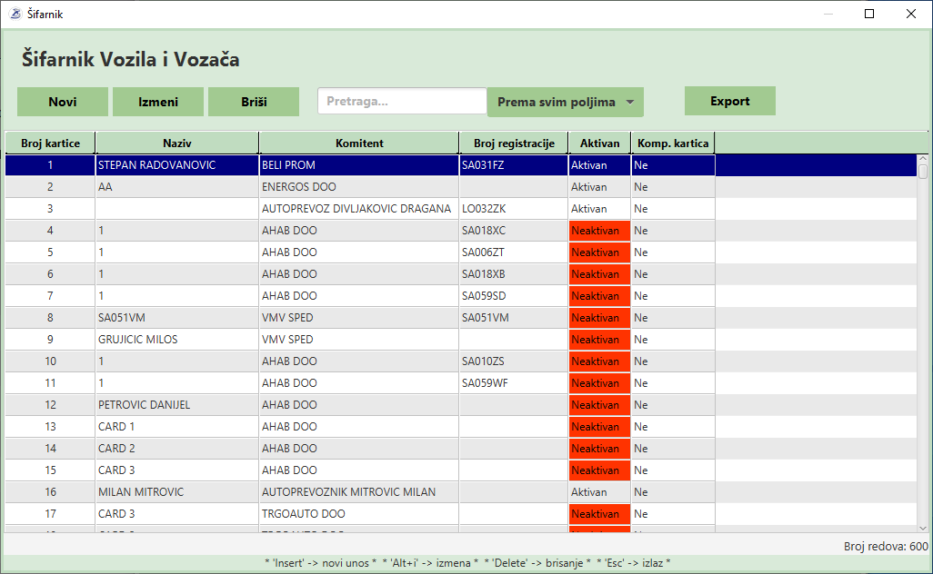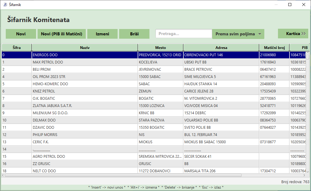Prozor komitent je šifarnik aktivnih i neaktivnih pumpi, broj pištolja, i prikazuje na koje su com portove povezani. Mogućnost unosa, izmene i brisanja.