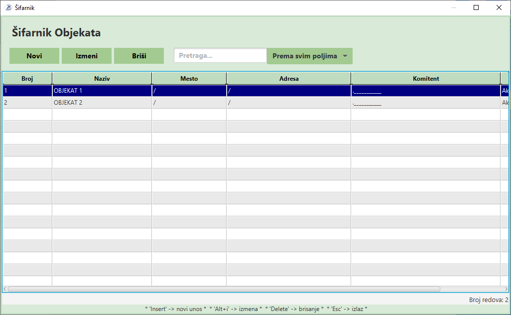 Prozor objekti je sifarnik svih pumpi koja firma ima sa mogućnošću upisivanja novih, izmene i brisanja.