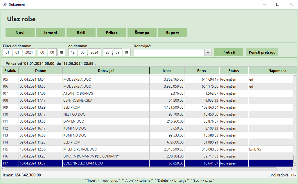 Ulaz robe je meni preko koga se vrši administracija unosa, izmene i brisanja ulaza robe.