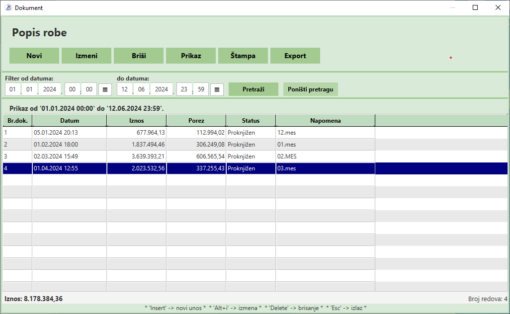 Prozor popis robe je kompletna evidencija izvršenih popisa.