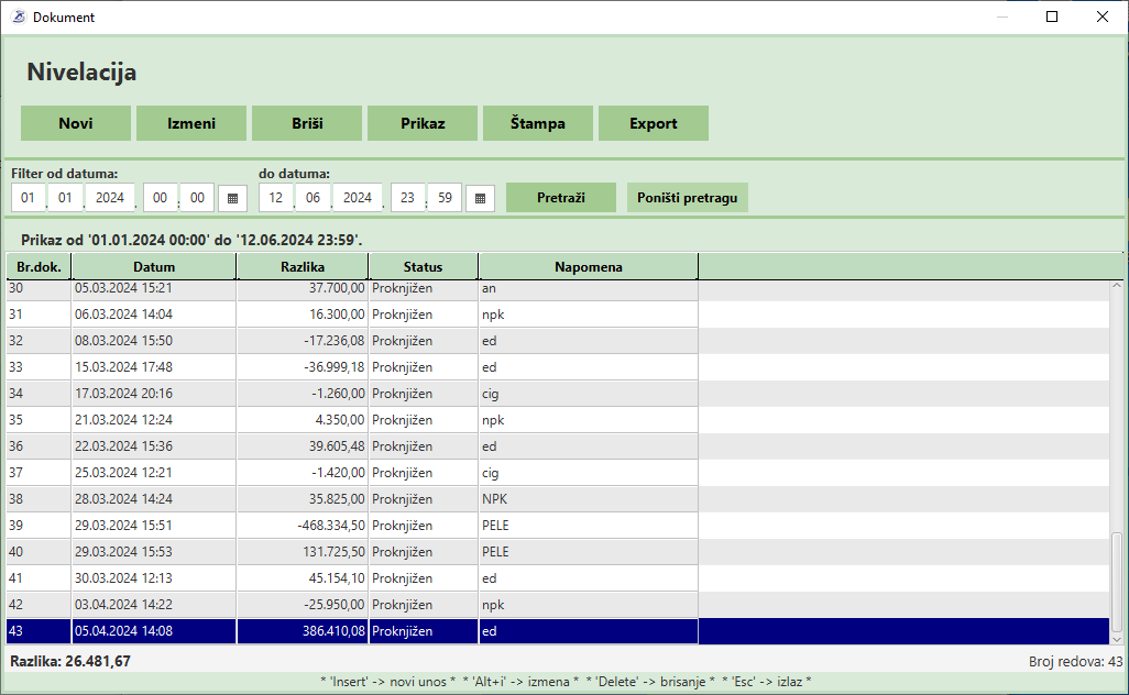 Prozor nivelacija prikazuje kompletne izvršene nivelacije i popuste koji su odobreni. Omogućava se unos novih, izmene, brisanje, uvoz kalkulacije, popuste, eksport u .xls formatu