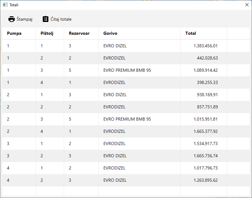Totali je glavni prozor preko koga se prate količine istočenog goriva i prilikom završetka dana kreira DPI.